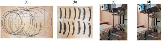 Mechanical properties tests along the length of 5.5 mm diameter wire rod of 20MnB4 steel grade: (a) wire rod coils, (b) samples for mechanical properties testing, (c) example sample before tensile test, (d) example sample after tensile test.