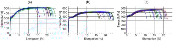 Examples of tensile curves of 20MnB4 steel grade wire rod samples: (a) technological variant—V1, (b) technological variant—V2, (c) technological variant—V3.