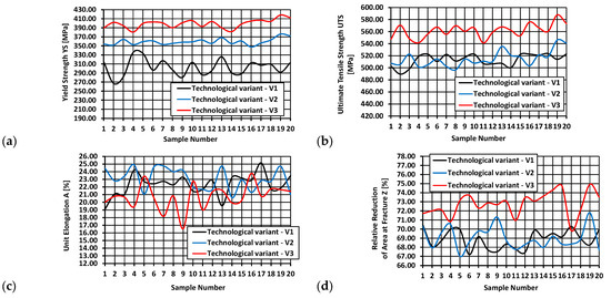 Furthermore, upon analyzing data presented in Table 6, it was found that in the case of wire rods produced according to the V1 variant, the standard deviation values were 18.34 for yield strength, 10.08 for ultimate tensile strength, 1.44 for unit elongation and 1.03 for relative reduction in area at fracture. The variation coefficients of wire rods produced according to the V1 variant were 0.061 for yield strength, 0.02 for ultimate tensile strength, 0.065 for unit elongation, and 0.015 for relative reduction in area at fracture.