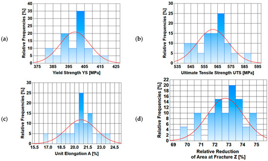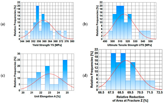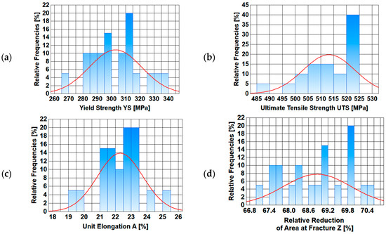Normal distribution diagrams of selected mechanical properties along the length of a 5.5 mm diameter wire rod of 20MnB4 steel grade—technological variant V1: (a) Yield Strength (YS), (b) Ultimate Tensile Strength (UTS), (c) Unit Elongation (A), (d) Relative Reduction in Area at Fracture (Z).