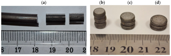 General view of wire rod of 20MnB4 steel grade samples for cold upsetting tests: (a) method of samples preparation from the finished product for cold upsetting tests, (b) view of samples after cold upsetting test (wire rod after the rolling process according to technological variant V2) with relative plastic strain value: (b) 50%, (c) 67%, (d) 75%.