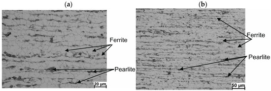 Example of the microstructure of a 5.5 mm diameter wire rod of 20MnB4 steel grade—longitudinal section—technological variant V1: (a) magnification 500×, (b) magnification 200×.