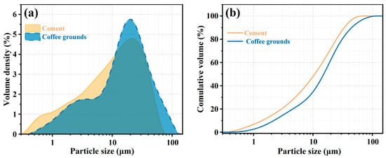 Particle size distribution curve and cumulative distribution curve of cement and CGs. (a) volume density; and (b) cumulative volume.