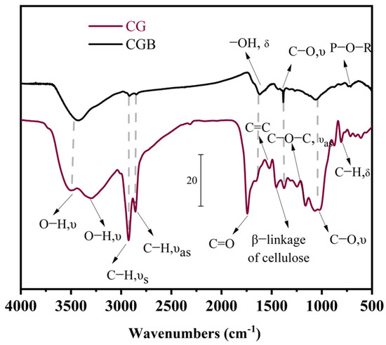 3.1. Comparison of XRD, FTIR, and BET between CGs and CGB