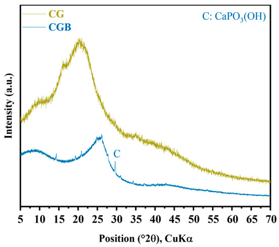 The XRD pattern of CGB is depicted in Figure 5. Similar to CGs, CGB also displays characteristic broad diffraction bands within the range of 2θ = 10−30°. This is primarily attributed to the presence of amorphous carbon compounds, such as lignin and hemicellulose [19]. In comparison with CGs, the amorphous hump intensity of CGB diminishes and shifts to a higher 2θ angle, particularly one concentrated around 26°. This alignment with the typical peak characteristics of pure carbon suggests that the residual carbon after the pyrolysis of CGs exists in the form of pure carbon in CGB [20]. Furthermore, a distinct CaPO3(OH) crystal peak was identified in the CGB. At the same time, it can also be seen in Table 1 that CGB contains a large amount of P2O5. In the FTIR analysis (Figure 4), it became evident that in comparison to CGs, CGB exhibits pronounced absorption bands solely at 3420 cm−1, 1050 cm−1, and 1375 cm−1, with the disappearance of the remaining absorption bands. This is primarily attributed to the fact that a substantial portion of the organic compounds in CGs underwent decomposition under the influence of high temperatures during the pyrolysis process. The absorption peak at 1050 cm−1 can be ascribed to the P−O−R bond formation resulting from the reaction between H3PO4 and CGs. This is similar to the results observed by Ma et al. [19]. According to the Brunauer–Emmet–Teller measurements of the specific surface area for CGs and CGB (Figure 6), it is evident that the specific surface area of CGB is significantly greater than that of CGs. This indicates that the phosphoric acid high-temperature pyrolysis of CGs results in a distinct pore structure and augments the specific surface area of CGB. Molina-Sabio et al. also found a similar phenomenon [4]. As evident from the Supplementary Material (Tables S1−S3), CGB exhibits a larger pore volume and smaller pore diameter than CGs.