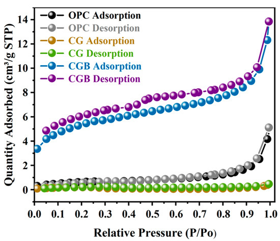 Nitrogen adsorption–desorption isotherms of cement, CGs, and CGB.