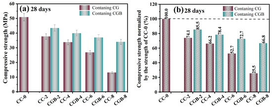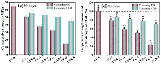 Compressive strength: (a) compressive strength of mortars at 28 days; (b) compressive strength of mortars normalized to the strength of CC-0 at 28 days; (c) compressive strength of mortars at 90 days; (d) compressive strength of mortars normalized to the strength of CC-0 at 90 days.
