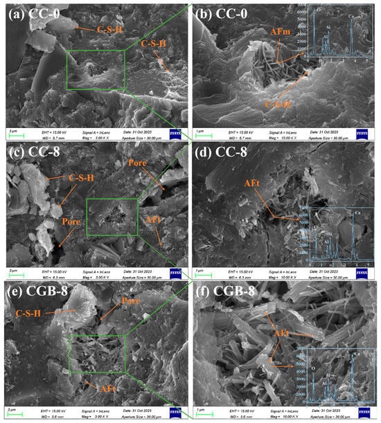 (a) SEM images of the CC-0 sample after 28 days; (c) SEM images of the CC-8 sample after 28 days; (e) SEM images of the CGB-8 sample after 28 days; (a,c,e) represent SEM images magnified 3000 times, respectively; (b,d,f) represent SEM images magnified 10,000 times, respectively.