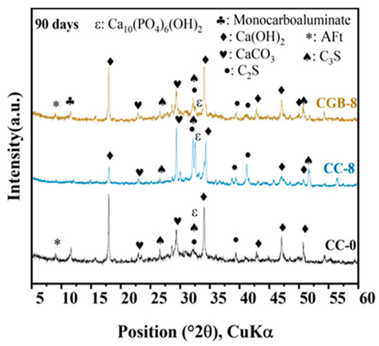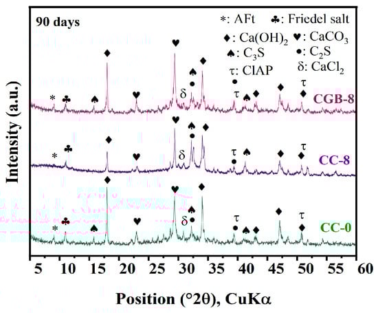 The chloride ion adsorption rates of the clean slurry specimens at 28 and 90 days are illustrated in Figure 11. It is evident from the figure that with the increase in the amount of CGs, the chloride ion binding rate of the clean slurry specimen exhibits a decreasing trend at both 28 and 90 days. It is well known that the adsorption of chloride ions by cement primarily occurs through the reaction of C3A and chloride ions, leading to the formation of FS, as well as the physical combination of C−S−H gel. The XRD pattern (Figure 12) reveals the presence of FS in the CG sample. However, as analyzed in Section 3.2, the inclusion of CGs significantly impedes the formation of C−S−H gel [25]. Therefore, it is speculated that the inclusion of CGs primarily affects the physical adsorption of chloride ions by C−S−H gel, thereby reducing the chloride ion adsorption rate of cement.