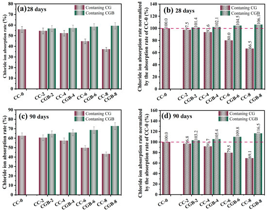 Chloride ion adsorption rate of pastes: (a) chloride ion adsorption rate at 28 days; (b) 28-day chloride ion adsorption rate of mortars normalized by the adsorption rate of CC-0; (c) chloride ion adsorption rate at 90 days; (d) 90-day chloride ion adsorption rate of mortars normalized by the adsorption rate of CC-0.