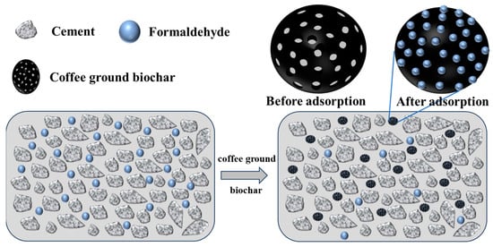 In cementitious materials, chloride ions combine through two distinct mechanisms. One involves chemical combination via hydration products, leading to the formation of compounds such as Friedel’s (FS) salt or Kuzel’s salt. The other mechanism involves hydration. The product is physically combined through the adsorption process via C-S-H gel [5,6]. Prior research has indicated that the primary mechanism through which cement-based materials eliminate formaldehyde is the adsorption of formaldehyde molecules by the inherent pore structure of the cement itself. Simultaneously, the cured formaldehyde molecules undergo oxidation and decomposition into H2O and CO2 in the presence of strong hydroxyl radicals. Hadj et al. [7] attempted to enhance the formaldehyde adsorption of cement by incorporating TiO2. Their findings revealed that when the TiO2 content was 5%, the photocatalytic degradation rate of formaldehyde by cement reached its optimal level. Verriele et al. [8] conducted a characterization of the formaldehyde adsorption capacity of lime–cement–gypsum composite materials. Their study revealed that the composite material can convert formaldehyde into gaseous methanol and adsorbable formate, resulting in a substantial reduction in indoor formaldehyde concentrations. On the other hand, Boonamnuayvitaya et al. [9] used a ZnCl reagent and nitrogen impregnation to activate CGs to prepare CGB and found that the hydrophilic functional group of the CGB has a high adsorption capacity for formaldehyde. Ahn et al. [10] discovered that the pyrolysis of sludge and CGs combined resulted in the formation of a novel type of metal-embedded CGB. This CGB exhibited an impressive formaldehyde adsorption capacity of 1811 mg/g, showcasing its effectiveness in the removal of formaldehyde.