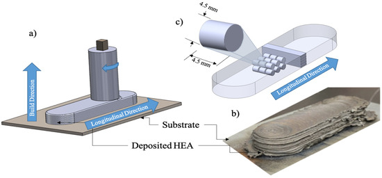 The annealed Al0.35CoCrFeNi rods were then machined down to 7.87 × 7.87 mm rectangular feedstock pieces to be used as feedstock for the AFSD process. An aerosol graphite lubricant was applied to the rods before deposition per the manufacturer’s suggestions to prevent jamming of the feedstock in the deposition tool. A commercially available B8 AFSD machine (MELD Manufacturing, Christiansburg, VA, USA) was used to deposit the heat-treated Al0.35CoCrFeNi material onto a 46,100 steel substrate in a layer-by-layer approach. A 15-layer build was made with a 1 mm layer height and can be seen in Figure 1b. Figure 1a depicts the tool orientation and material orientation nomenclature used throughout this document. The build parameters used for the Al0.35CoCrFeNi deposition were as follows: spindle rotation speed of 500 rpm, traversing speed of 31.8 mm/min, and actuator feed rate of 27.9 mm/min. After deposition, mechanical test specimens were machined from the as-deposited material via a Mitsubishi MV1200 wire electrical discharge machine (EDM, Mitsubishi Electric Co., Ltd., Tokyo, Japan). Specimen were cut to the dimensions shown in Figure 1c for both quasi-static and intermediate-rate testing and we utilized a specimen height of 4.5 mm and a diameter of 4.5 mm.