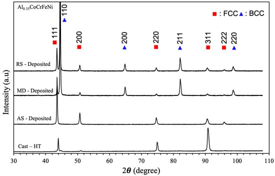 XRD patterns for the Al0.35CoCrFeNi high-entropy alloy for the annealed condition and then after additive friction stir deposition for the advancing side (AS), middle (MD), and retreating side (RS).