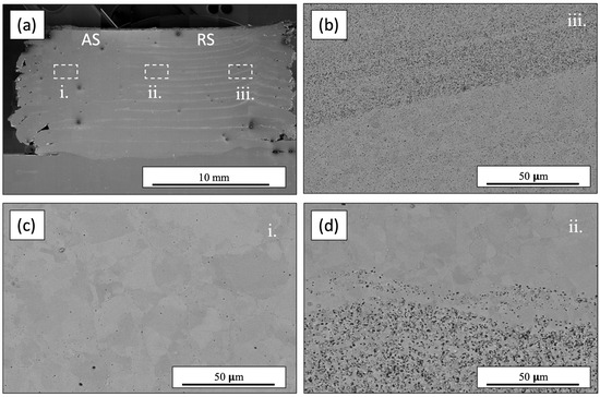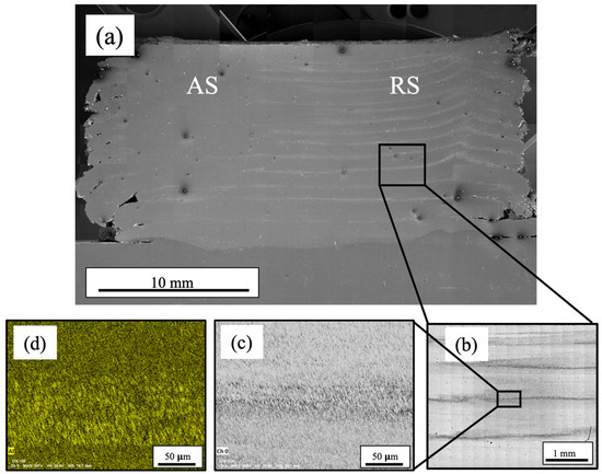 Scanning electron microscope backscatter electron images of the additive friction stir deposited overview (a), retreating side (b), advancing side (c), and middle (d).