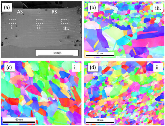Electron backscatter diffraction inverse pole figure maps of the additive friction stir deposited overview (a), retreating side (b), advancing side (c), and middle (d). Bands of dynamically recrystallized grains can be seen in (b,d) with a significantly smaller grain size due to Zener pinning.