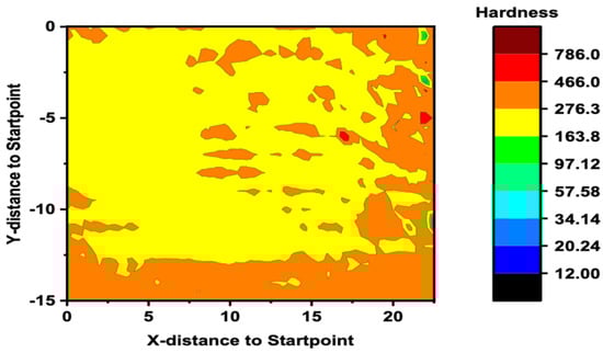 To further understand these regions, microhardness tests were performed on the entire cross section of the deposit. The microhardness grid revealed a similarly layered structure to that of the SEM backscatter image with a significantly increased hardness at the locations with high concentrations of Al-rich particles, as can be observed in Figure 7. The increased hardness was likely from a mix of decreased grain size, due to Zener pinning, as well as the presence of a BCC phase due to the higher concentrations of Al. Significant work has been performed in the literature displaying the effects of Al content on the breakdown of FCC and BCC phases in AlCoCrFeNi composition. Kao et al. reported the increase in hardness and the shift from a predominantly FCC structure to a split FCC/BCC and then to a predominantly BCC structure with increasing Al content [20]. Similarly, Joseph et al. studied the increase in Al content in AlCoCrFeNi alloys through the use of nanoindentation and observed an increase in nano-hardness in the BCC structure over that in the FCC structure [41]. The individual layers deposited can be observed for both the middle and RS locations with significant increases in hardness leading to the Al-rich locations and then decreasing again when moving away. The average annealed hardness was found to be ~175 HV as a comparison.