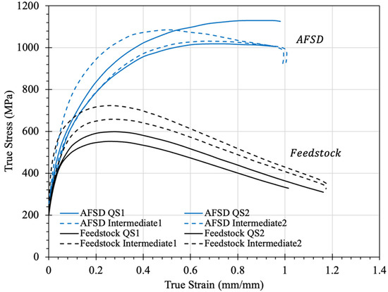 The feedstock material also exhibited a strain rate sensitivity when increasing from the 0.001 s−1 strain rate to that of the 1 s−1. Positive strain rate sensitivity for peak stress and yield stress could be due to the higher rate of increasing the barriers of dislocation motion for mechanically and thermally activated deformations. Another cause could be the higher strain rate decelerating the dislocation annihilation [43]. An increase in maximum stress from an average of 575 MPa to 690 MPa was observed for the 0.001 s−1 and 1 s−1 rates, respectively. However, the AFSD material did not exhibit the same trend. A larger scatter can be observed in the AFSD material’s stress–strain behavior with maximum stresses overlapping for the 0.001 s−1 and 1 s−1 rates and averages of 1074 MPa and 1057 MPa, respectively. The cause of the apparent strain rate insensitivity could be due to the placement of samples taken in the AFSD deposit. Material from both the AS and RS portions of the deposit were used in the mechanical testing. However, Figure 7 shows an obvious discrepancy in the overall hardness of the deposit when proceeding from the retreating side to the advancing side. The change in local mechanical properties could be contributing to the variation in the overall response.