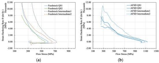 Kocks–Mecking plot showing variation in dσ/dε as a function of flow stress for the (a) annealed HEA material and (b) additive friction stir-deposited (AFSD) HEA material evaluated using compression at 0.001 s−1 (QS) and 1 s−1 (intermediate) strain rates.