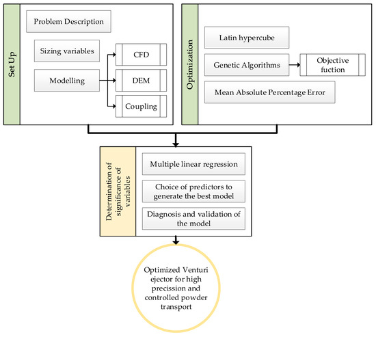 This work presents a methodology for optimizing the dimensions of Venturi injectors with low pressure for the transportation of powder with high accuracy. To achieve this, this section presents the description of the problem and the main dimensions of Venturi injectors; then, the modeling of the problem (both from the point of view of the flow, CFD, particle interaction, DEM, and coupling between them); and finally, the optimization tools used to obtain the optimal design. Alongside this, the final section explains the statistical tools used to determine the significance of variables with the results obtained. This process follows the flowchart shown in Figure 2.