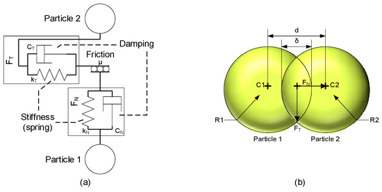 When two particles come into contact, the force is distributed into two components called the normal force () and tangential force (), as can be seen in Figure 4b. The definition of each of these forces depends on the model.