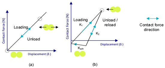 Depending on the mathematical model used, the energy transferred by these interactions is represented to a greater or lesser extent in the equations of motion. An example of this is shown in Figure 5, where the contact force–motion functions are depicted: Figure 5a is the representation of the most basic contact model (Hert–Mindlin contact model) [28,29,30,31,32], and Figure 5b depicts the Edinburgh Elasto-Plastic Adhesion contact model.