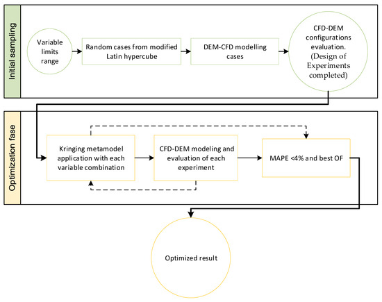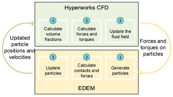 To study the behavior of the particles in the fluid in motion, a joint computational fluid dynamics (CFD) and discrete element method (DEM) simulation was carried out, using the models explained above, in each simulation time step. For this purpose, the software tools Altair Edem® (2022 version) and Altair Hyperworks CFD® (2022 version) were run together, following the workflow shown in Figure 6.