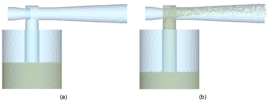 To carry out this study, a simulated environment was developed. For these simulations, 3 interactions must be taken into account: the fluid, the particle–particle interaction, and the interaction between the fluid and the particles. In addition, the simulation interval time must be the minimum possible with the objective of reducing the computational time, but enough to guarantee powder ejection from the Venturi. In this study, that time was 2 s.