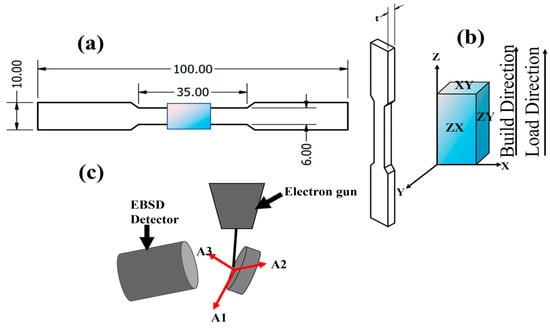 Schematic diagram of (a) the dog-bone-shaped samples illustrating the geometrical dimensions; (b) build direction and loading direction, with “t” indicating the thickness (1.5 mm and 4.0 mm); and (c) the scanning direction when observed under EBSD.