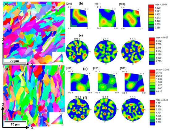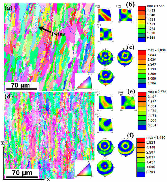 IPF maps of deformed L-PBF 316L stainless steel with their respective inverse pole figure plots and pole figures: (a–c) represent 1.5 mm and (d–f) represent 4.0 mm thick samples. Grains had a preferred orientation toward the Z-axis in both thicknesses.