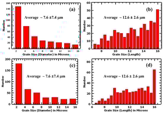 Average grain size, where (a,b) represent the diameters and lengths of 1.5 mm thick samples and (c,d) represent the diameters and lengths of 4.0 mm thick samples.