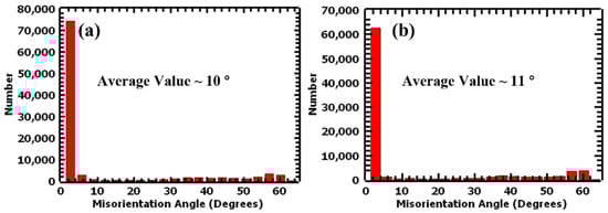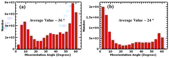 Average misorientation angle distribution charts of undeformed L-PBF 316L stainless steel: (a) 1.5 mm and (b) 4.0 mm.