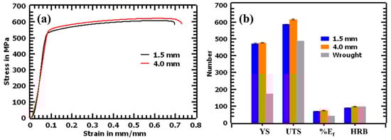 (a) Stress–strain curves of 1.5 mm and 4.0 mm thick samples and (b) average YS, UTS, Ef, and HRB values for L-PBF and ASTM standard values.