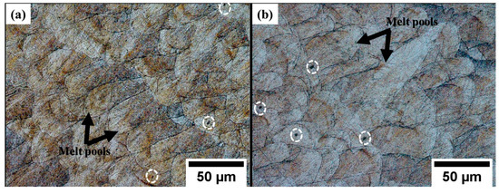 The samples etched with Kalling’s reagent revealed the presence of melt pools, as shown in Figure 3a,b. These melt pools exhibited an arc shape, which resulted from the layer-by-layer deposition process employed in additive manufacturing. As the new layers were deposited on top of previously deposited layers, the laser beam partially remelted the previous layer, leading to the observed overlaps. The rapid solidification rates of L-PBF, usually in the range of 105 to 108 K/s, resulted in the formation of fine cellular structures and columnar dendritic structures [17,23]. The temperature gradient G and the growth rate R play an important role in determining the type of structures formed during solidification. The G/R ratio is used to determine the solidification mode, while the product of G and R influences the size of the structures formed. At high G/R planar solidification features are formed, whereas at low G/R, cellular or dendritic features are formed. When G × R is high, finer and more uniform structures are formed. Therefore, it is crucial to control the temperature gradient and growth rate in the L-PBF process to ensure the desired solidification features, which can impact the mechanical properties, are obtained [32,33]. Epitaxial growth, where the cellular structures grow across melt pool boundaries while retaining their preferred growth direction [1], is depicted by the red dotted circles. Dark spots were observed on the etched surfaces, as depicted by the white dotted circles. These dark spots were observed to mainly occur at the melt pool boundaries and were assumed to be incomplete fusions or pores due to temperature gradients.