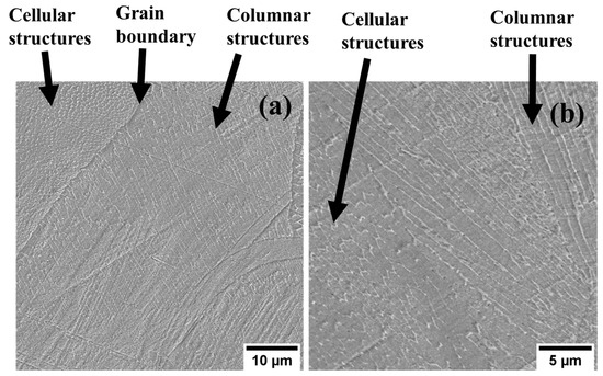 Representative SEM images of the etched L-PBF 316L stainless steel samples showing cellular and columnar structures: (a) 1.5 mm and (b) 4.0 mm.