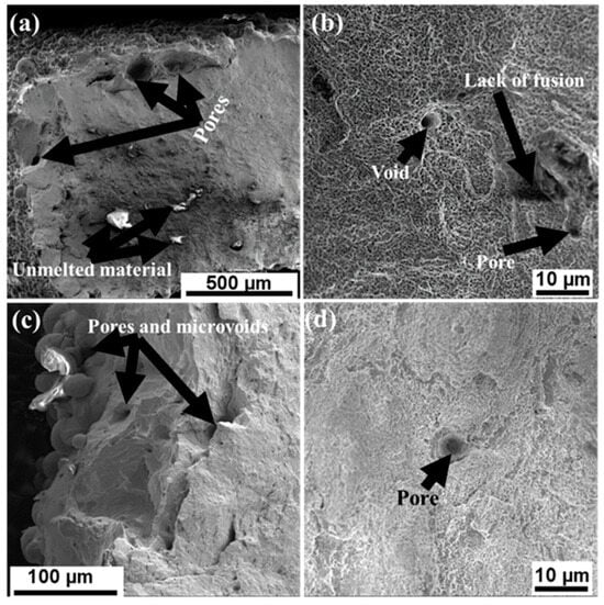 Moreover, in the course of deformation, microvoids were initiated at regions characterized by localized strain discontinuities. Pre-existing defects, such as pores and lack of fusions, observed in the as-built undeformed surfaces served as favorable sites for the nucleation or growth of microvoids. With increasing tension loads, the pores merged to form microvoids, and these microvoids expanded and coalesced with adjacent ones. This resulted in the numerous voids observed on the fractured surfaces of deformed samples compared with the undeformed samples. The closer the pre-existing pores were to each other, the faster they promoted the nucleation and merging of microvoids [46], as shown in Figure 13. The presence of unmelted particles shown in Figure 13a,c were formed due to the laser power insufficiently melting the powder particles. Remelting of the samples can aid in reducing the number of unmelted particles during fabrication [47]. The formation of these defects at the edges causes premature failure of the material.