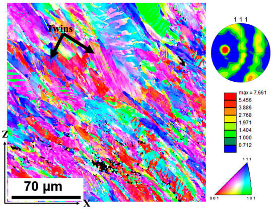 A closer observation of the IPF map in Figure 15a shows the existence of twins. To further clarify these occurrences, the surface was observed at a smaller step size of 0.3 μm. The EBSD step size was reduced because the step size determines the size of grains observed. With a step size of 1 μm, grains or features smaller than 1 μm can be filtered out. Thus, at 0.3 μm step size, twinning was quite evident in the deformed surface. Twinning, unlike slip, is polar in nature and relies strongly on the size of the grains and the strain rate [43]. Sinha et al. [48] illustrated that at room temperature, damage accumulates along the <100>-oriented grains, while the <101>-oriented grains enhance the strain hardening of the materials through twinning. Thus, the <101> grains observed in the undeformed state can be attributed to the enhanced strength and the induced deformation twins. The deformation mode of twinning was previously observed in the EBSD analysis of additively manufactured 316L stainless steel samples [49,50]. The {111} plane, which is usually closely packed in face-centered-cubic (fcc) crystal materials, is suitable for easy dislocation gliding and consequently promotes twinning [45]. Figure 16 shows that twinning mostly occurred in the {111}-oriented grains. The observed twins were found to be closely spaced.
