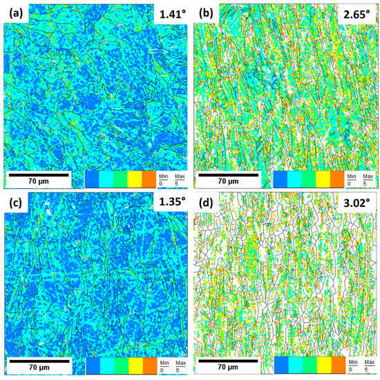 KAM maps of L-PBF 316L stainless steel with (a,c) representing undeformed samples and (b,d) representing deformed samples. (a,b) represent 1.5 mm, whereas (c,d) represent 4.0 mm. The intensity of localized strain was observed to increase when the samples were subjected to tensile loads, as illustrated by the increased KAM values.