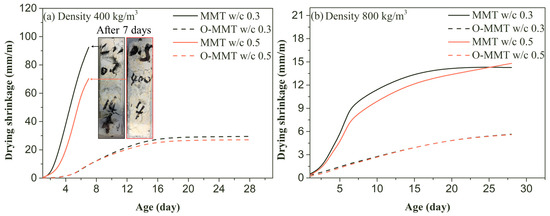 For the high-density samples (design density 800 kg/m3), the main water loss focused on the first 7 days. However, when the sample was continuously exposed to a dry environment, the water loss and shrinkage remained high because more complex and smaller pores in the high-density samples made water migration more difficult, and thus the significant loss of water took longer. Shrinkage is caused by water loss; therefore, the shrinkage of MNCP (high density) rapidly increased during the first 7 days of exposure, as shown in Figure 6, and extending the exposure time resulted in relatively lower shrinkage values. For the high-density and unmodified samples (MMT in Figure 6), severe shrinkage still occurred, but the broken phenomenon disappeared due to the lower content of pores and higher strength. Similar to the changing trend in the low-density sample, the shrinkage values of the modified sample fabricated by using the O-MMT slurry were lower than those of the unmodified sample (MMT). For instance, at 28 days of exposure, the shrinkage values of the high-density MMT sample were 14.50 mm/m and 14.81 mm/m, larger than those of the O-MMT sample (5.60 mm/m and 5.60 mm/m). The reduction rates of shrinkage were 61.4% and 62.2%, respectively, following the complete replacement of the O-MMT slurry, demonstrating a significant effect on drying shrinkage reduction.