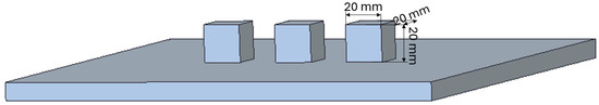 The specimens were arranged in cubes, each having an optimal edge length of 20 mm. Samples produced with identical process parameters were created simultaneously, centrally positioned on the build plate adjacent to one another (see Figure 1). Thus, the manufacturing process comprised 16 cycles, with each cycle employing a distinct combination of process parameters, and within each cycle, three specimens were produced as replicates.