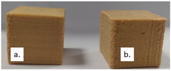 Experimental specimens manufactured with (a) SS = 110 mm/s, LH = 0.10 mm, and PT = 210 °C; (b) SS = 110 mm/s, LH = 0.25 mm, and PT = 200 °C.