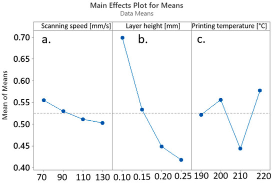 The main effect plots for means of Grey Relational Grades and their relationship with the values of the applied process parameters have determined the inverse proportion between the mean Grey Relational Grade and the applied scanning speed and layer height (Figure 5a,b), where, e.g., high values of scanning speed and layer height resulted in low means of Grey Relational Grade, and vice versa. In contrast, the effect of the printing temperature on the mean Grey Relational Grade seemed to be much more irregular (Figure 5c).