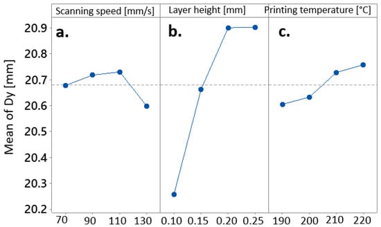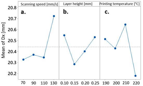 In light of optimizing the processing window, the amalgamation of FDM process parameters, encompassing a scanning speed of 70 mm/s, a layer height of 0.15 mm, and a a printing temperature of 220 °C, can be deemed as the most optimal configuration for attaining the utmost precision in the x-dimension of the fabricated cube. The mean effect plots describing the interdependencies between the x-dimension of the produced biocomposite cube and the variables of scanning speed (Figure 6a), layer height (Figure 6b), and printing temperature (Figure 6c) are presented in Figure 5.
