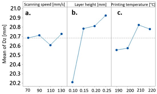 Main effects Plot for Means of the z-dimension affected by (a) scanning speed, (b) layer height, and (c) printing temperature.