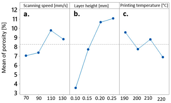 Main effects Plot for Means of porosity affected by (a) scanning speed, (b) layer height, and (c) printing temperature.