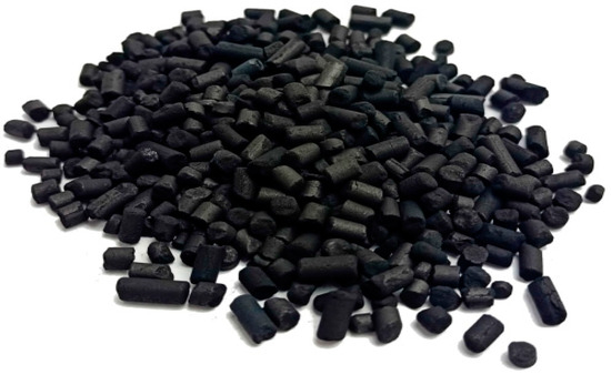 To compare the adsorption properties of BC and activated carbon (AC), AC granules (Figure 2) with a diameter of 4 mm were ordered from “trzmiel.com.pl”. The manufacturer reported that the product was in the form of granules with varying lengths and was commonly used in ponds and marine and freshwater aquariums to neutralize odors, chemical impurities, and discoloration without affecting water parameters. BC and AC were separately ground in a mortar into smaller particles for the adsorption experiments.