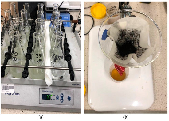 (a) Samples of solution and adsorbent on a shaker; (b) Filtration of the contents of the flasks after adsorption tests through filter paper.