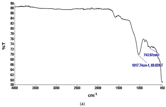 In Figure 4a, a prominent peak observed at 743.97 cm−1 indicates the presence of C=C bending in alkene bonds. Additionally, a peak at 1017.74 cm−1 corresponds to the C–O stretching characteristic of primary alcohols within the AC sample. The presence of alkene bending, indicating unsaturated carbon–carbon double bonds (π bonds) [62], can contribute to the overall surface properties of an adsorbent material and potentially affect its affinity for nitrogen adsorption. The C–O stretching in primary alcohols signifies the presence of hydroxyl (OH) functional groups. Hydrogen bonding interactions can enhance adsorption by increasing the affinity and retention of adsorbates on a material’s surface [63]. Nitrogen molecules can form hydrogen bonds with these hydroxyl groups, potentially enhancing the adsorption of nitrogen on the adsorbent surface [64].