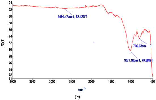 Several significant peaks can be observed in Figure 4b, each corresponding to distinct functional groups within the BC. The peak at 786.83 cm−1 signifies the C–Cl stretching in alkyl halides. At 1021.16 cm−1, a peak can be observed, indicating the C–N stretching in aliphatic amines. Furthermore, the peak at 2694.47 cm−1 represents the H–C=O:C–H stretching characteristic of aldehydes present in BC. The C–Cl stretching in alkyl halides indicates the presence of halogenated organic compounds which can enhance the interaction between nitrogen molecules and the adsorbent through dipole–dipole or charge-induced interactions [65]. C–N stretching occurs in aliphatic amines (amino functional groups). Nitrogen adsorption may be influenced by the presence of amine groups through chemical complexation or ion exchange mechanisms, thereby forming coordination bonds with nitrogen molecules [66,67], facilitating their adsorption. The H–C=O:C–H stretching in aldehydes indicates the presence of carbonyl (C=O) groups. Nitrogen adsorption may be influenced by these carbonyl groups through weak interactions, such as van der Waals forces or dipole-induced dipole interactions [68].