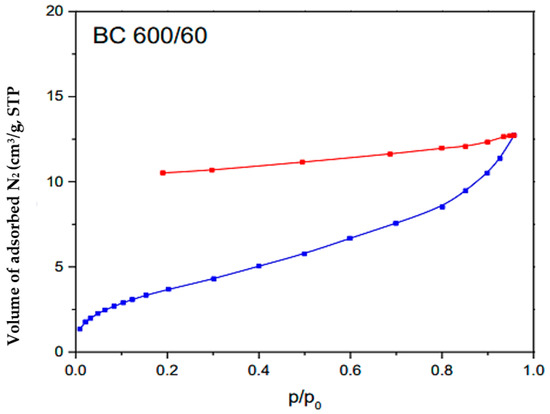 Figure 5 illustrates the outcomes of the BET analysis performed on the BC sample. The blue curve represents the adsorption isotherm (quantity of gas adsorbed at different pressures) and the red BET curve plot is the linear region derived from the adsorption isotherm used to determine monolayer capacity and specific surface area. The blue curves represent the experimental values. The observed adsorption isotherm aligns with the characteristics of Type IV isotherms, which typically indicate multilayered adsorption followed by capillary condensation on mesoporous materials. The biochar exhibited a specific surface area (SBET) with a value of 12 m2/g, indicating its capacity for surface interactions and adsorption processes. Moreover, the pore volume (VT) was measured at 0.0197 cm3/g, indicating the presence of mesopores and suggesting potential storage capacity for various molecules or ions [69]. This characterization also revealed a mean pore size (L) of 3.28 nm, which is between 2 and 50 nm [70], indicating the predominance of mesopores in the biochar structure. These structural properties highlight the biochar’s potential for adsorption-based applications, which can have significant implications for environmental remediation.