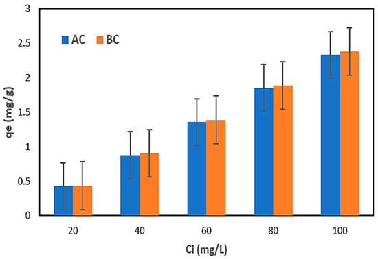 Table 3 displays the results of nitrogen adsorption employing the commercial AC and BC from the NH4Cl solution. The plots in Figure 6 illustrate the correlations between the qe and initial solution concentrations.